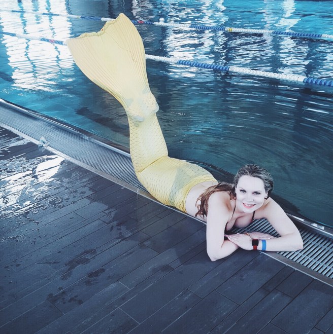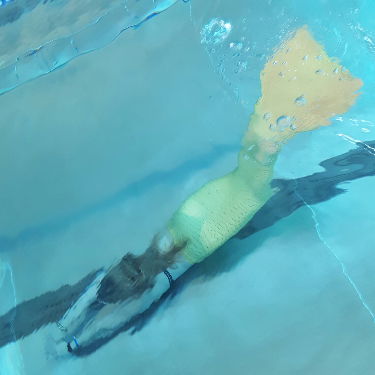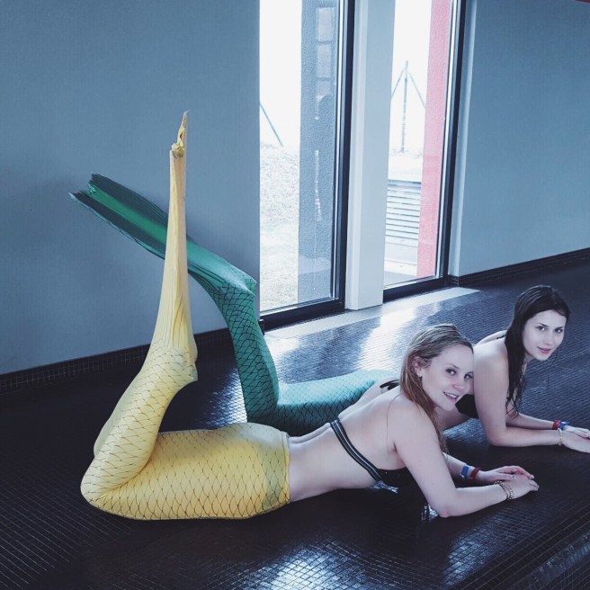 Und unser großer Moment – wir durften die Flossen anziehen. Diese erinnern an Taucherflossen, die miteinander verbunden sind und werden auch Monoflossen genannt. Um den Look perfekt zu machen zieht man darüber noch einen Anzug mit Schuppenoptik und voilá man fühlt bereit um die Meere/den Pool zu erkunden. Die Schwimmtechnik einer Mermaid ist definitiv schwieriger und anstrengender als gedacht.