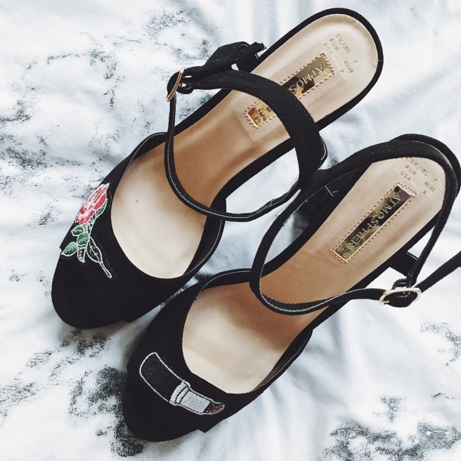 Also habe ich mir günstige Peeptoes mit Blockabsatz in schwarz besorgt und mich auf die Suche nach tollen Patches begeben, was auch nicht ganz einfach war. Bei H&M wurde ich jedoch schlussendlich fündig und habe mich für eine Rose, einen Mund, einen Lippenstift und ein rundes Emblem „Plant Lady“ entschieden.