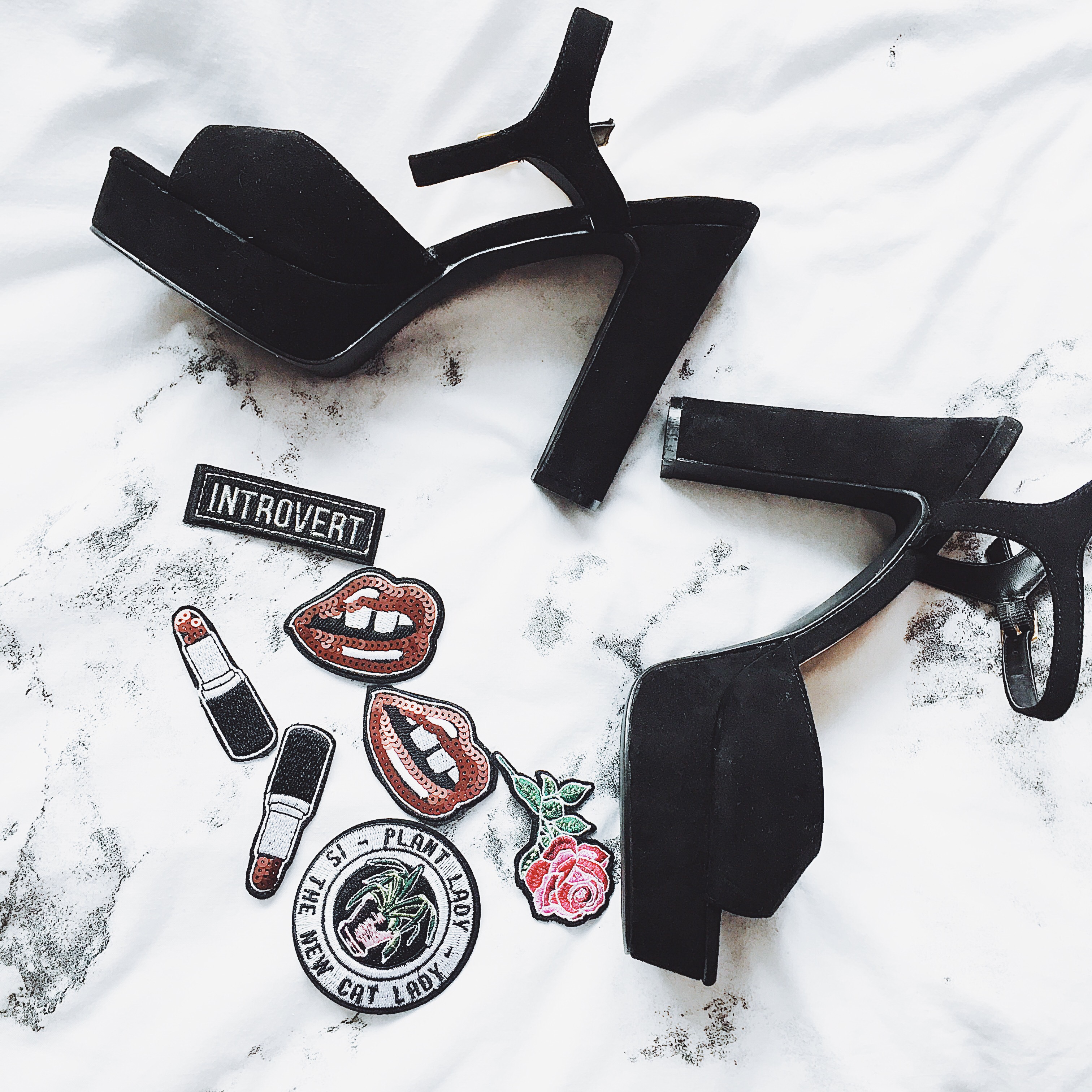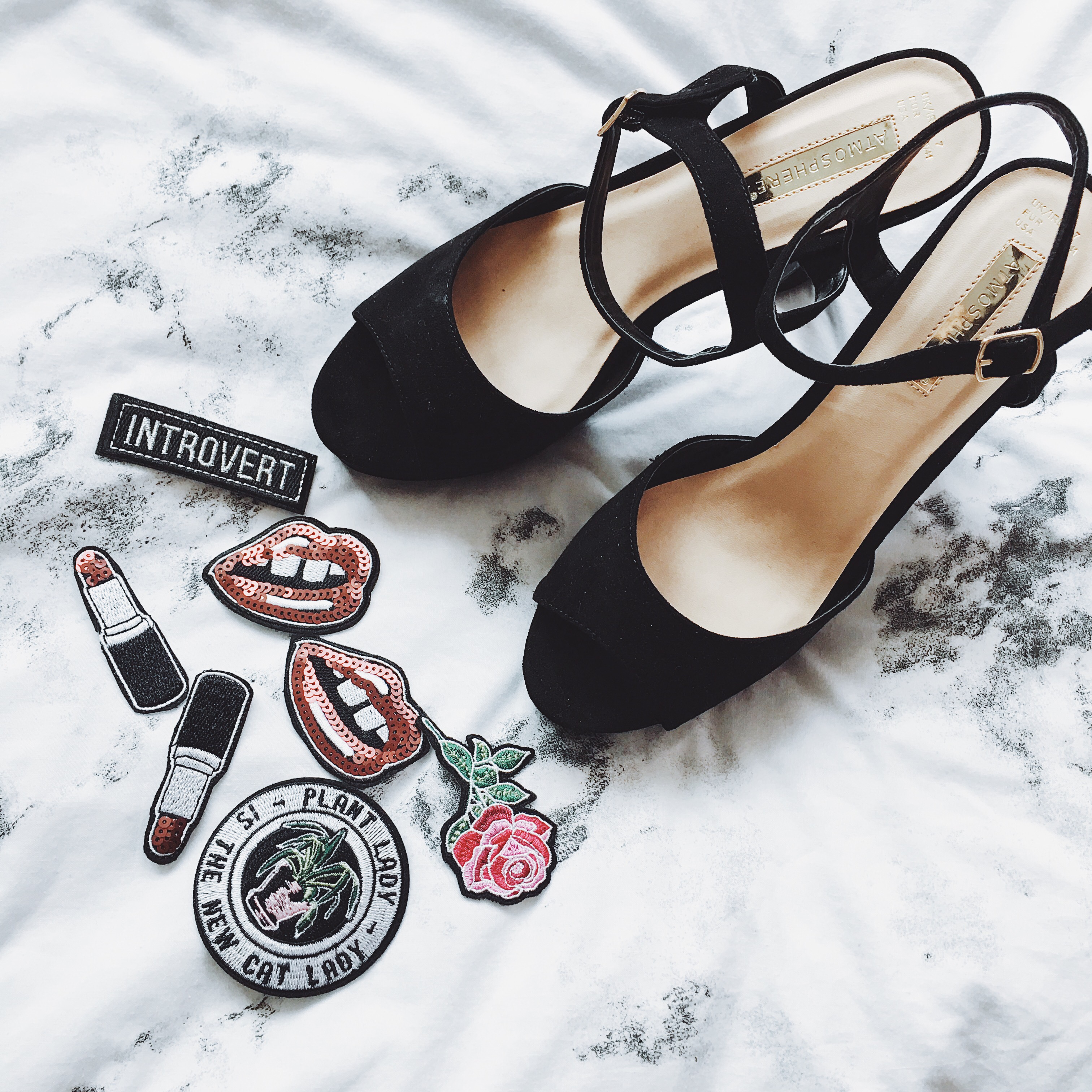 Also habe ich mir günstige Peeptoes mit Blockabsatz in schwarz besorgt und mich auf die Suche nach tollen Patches begeben, was auch nicht ganz einfach war. Bei H&M wurde ich jedoch schlussendlich fündig und habe mich für eine Rose, einen Mund, einen Lippenstift und ein rundes Emblem „Plant Lady“ entschieden.