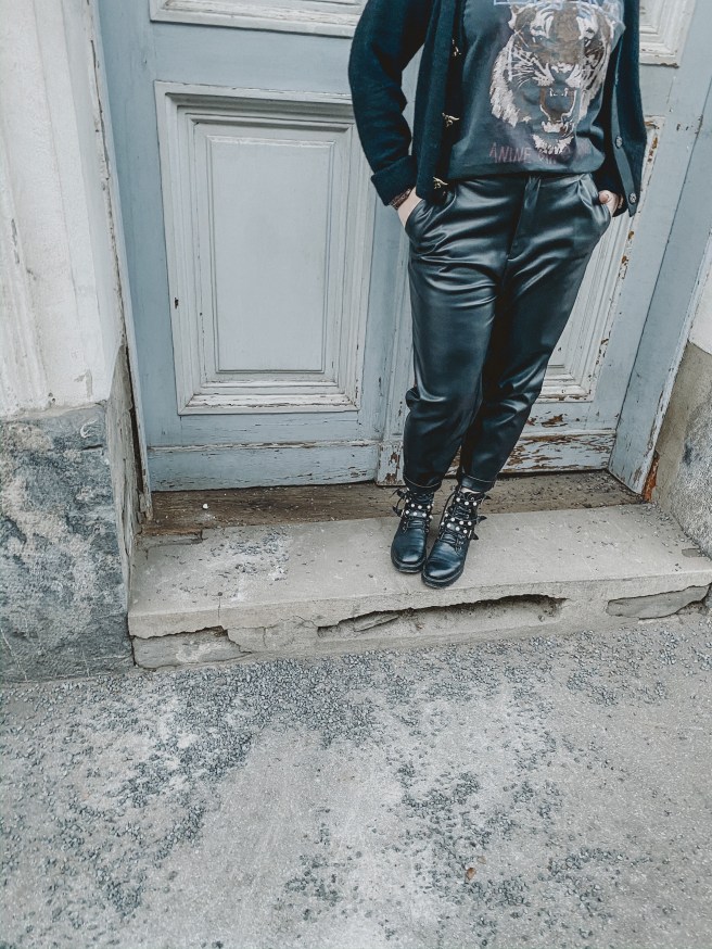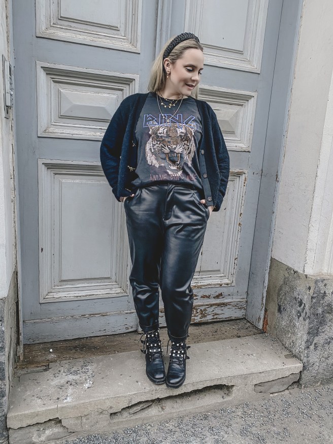 Wie ihr ein richtig cooles Outfit mit der Slouchy Leather Pants kreieren könnt, zeigen wir euch mit diesem rockigen Look, bei dem ich eine die Slouchy Lederhose lässig zu einem rockigen Shirt von Anine Bing und um den winterlichen Temperaturen zu strotzen noch mit einem Cardigan kombiniert habe.