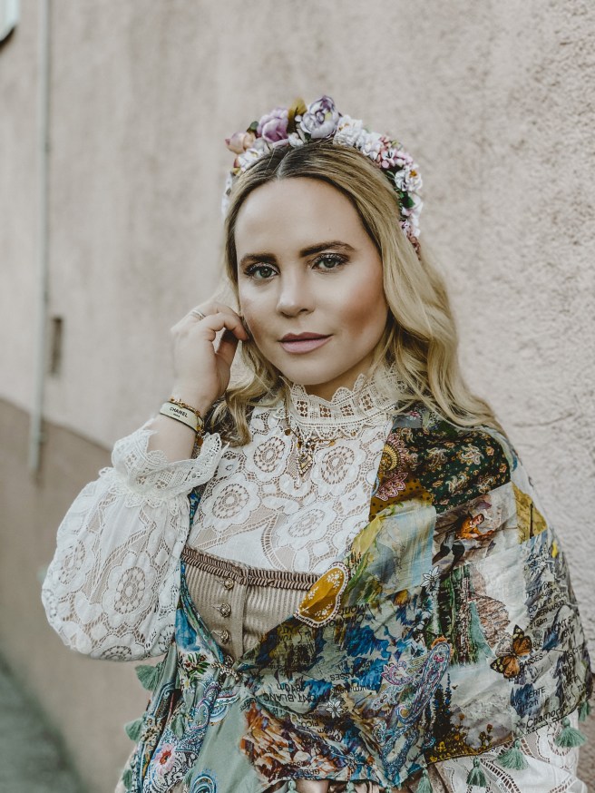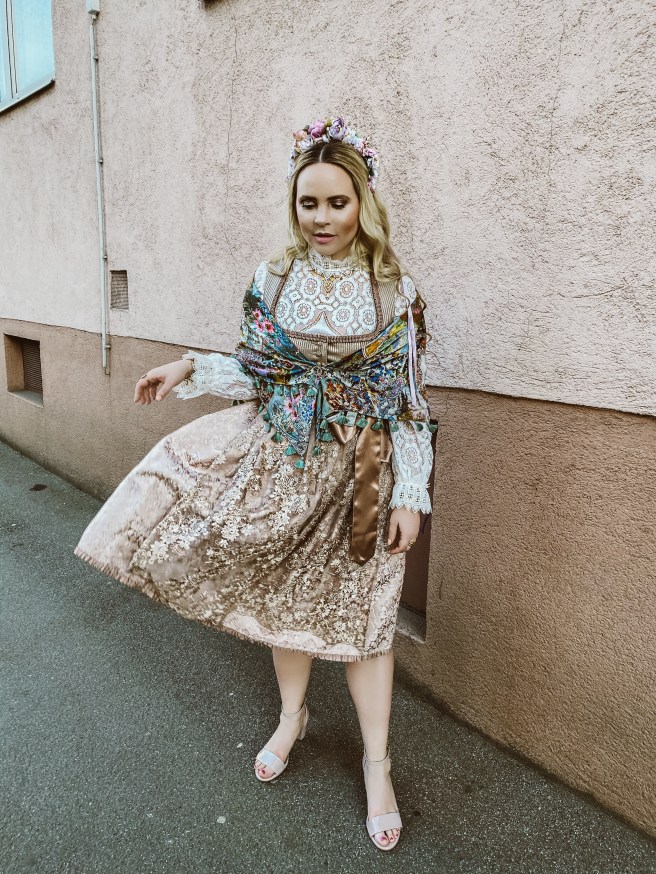 Der absolute Hingucker waren übrigens unsere Flowercrowns von We Are Flowergirls und unser seidenes Trachtentuch von Codello in Pastelltönen. Abgerundet wird der Look durch nude farbene Sandalen von CCC Shoes & Bags Austria.