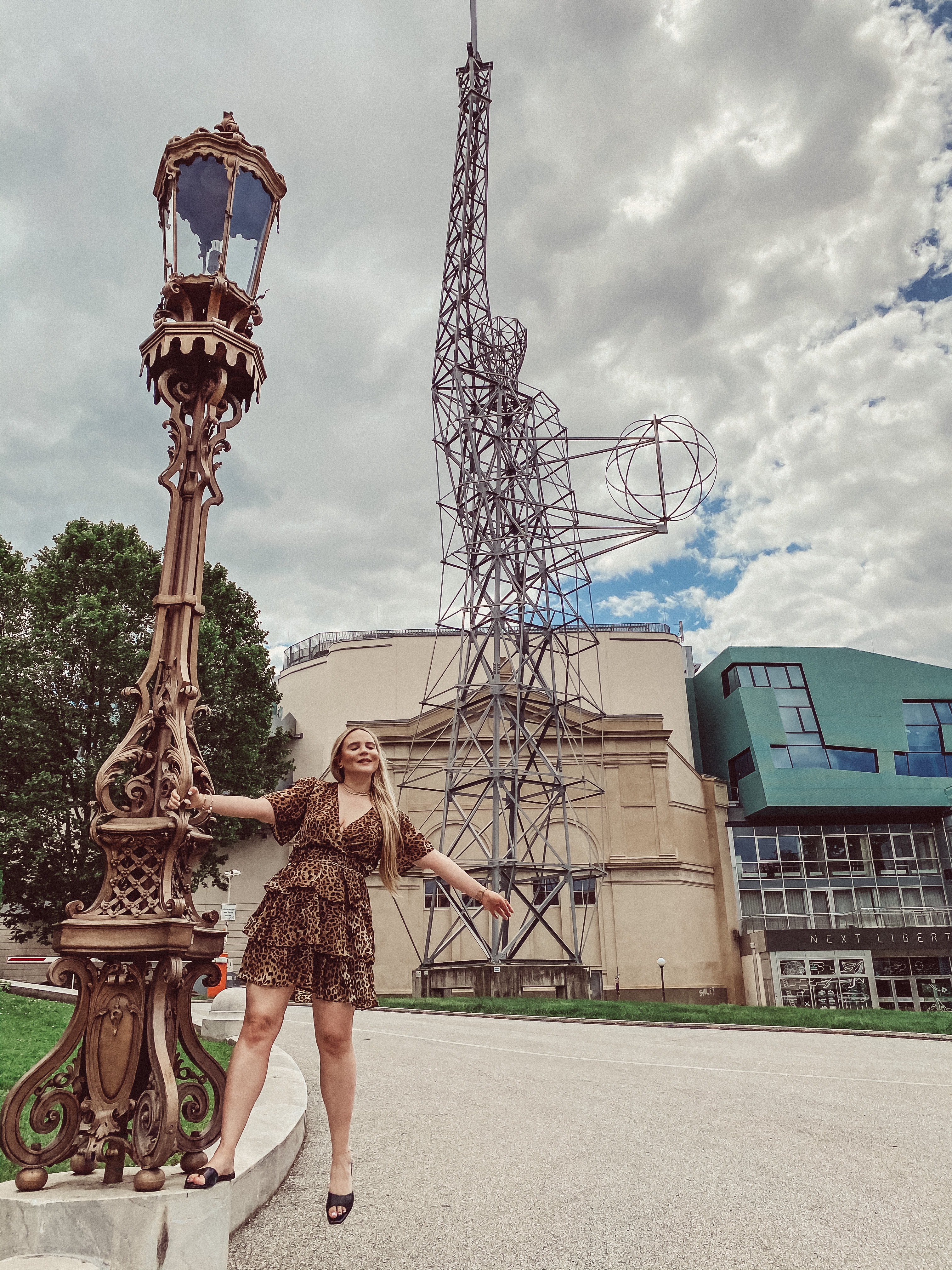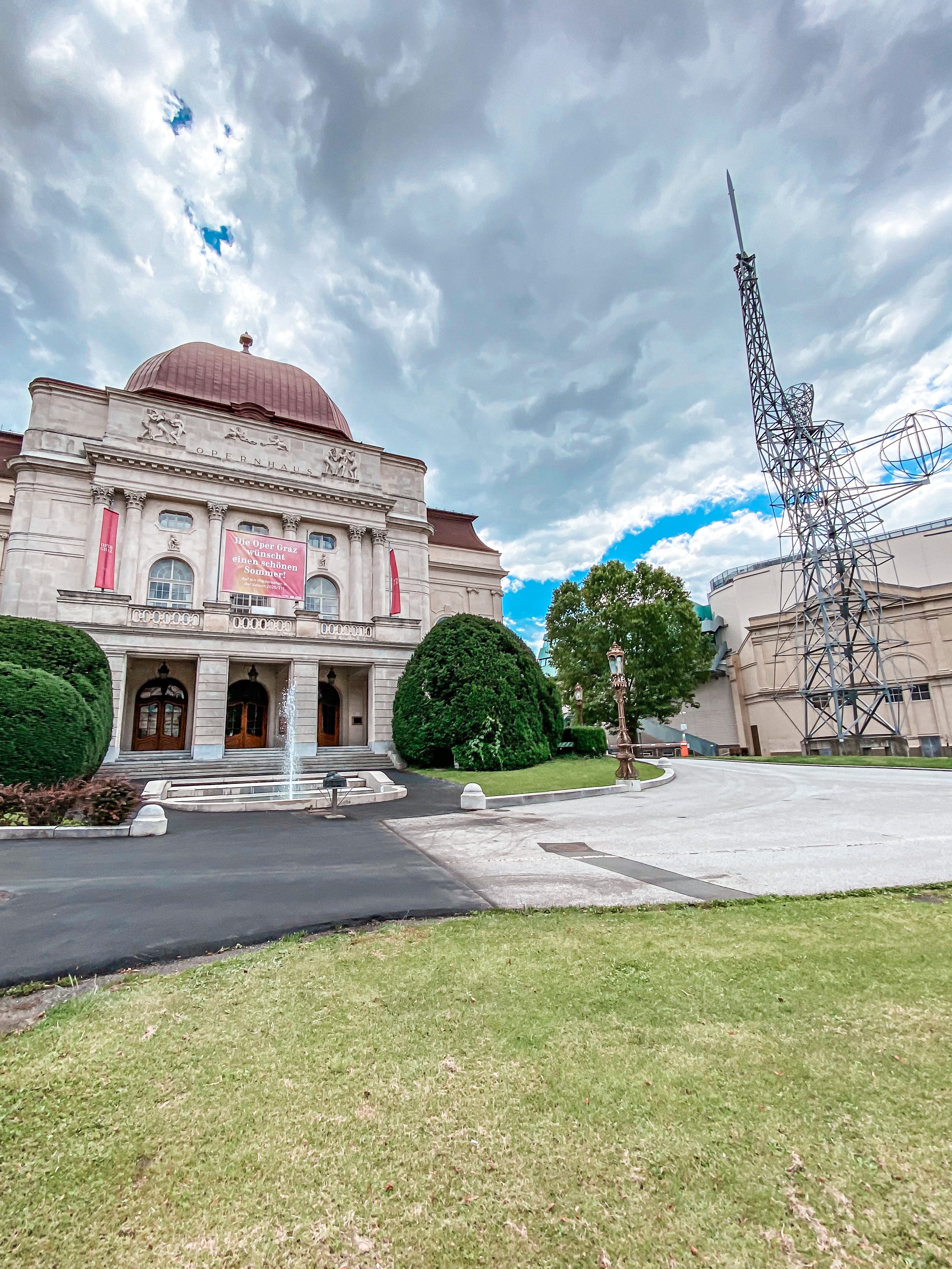 Weiter geht’s mit der 1er – die Straßenbahn bringt uns direkt zu unserem nächsten Stopp – Kaiser Josef Platz/Oper. Dort ausgestiegen sieht man die Oper von hinten, geht man unter der verglasten Stahlbrücke, die die Oper mit dem Kulissendepot verbindet, hindurch, erblickt man sogleich die Grazer Freiheitsstatue – besser als Lichtschwertstatue bekannt. 1992 stand der steirische Herbst unter dem Motto „America Nowhere“. Die von Hartmut Skerbisch designte Statue war eigentlich nur als temporäres Kunstwerk geplant, wurde aber schnell zu einem Wahrzeichen von Graz. Tatsächlich ist es eine im Maßstab 1:1 Nachbildung der Freiheitsstaute New Yorks, bloß ohne die Kupferhülle. Einzig die Fackel wurde durch ein Schwert und die Inschrift-Tafel durch eine Kugel ersetzt – ein Stück Amerika mitten in Graz.