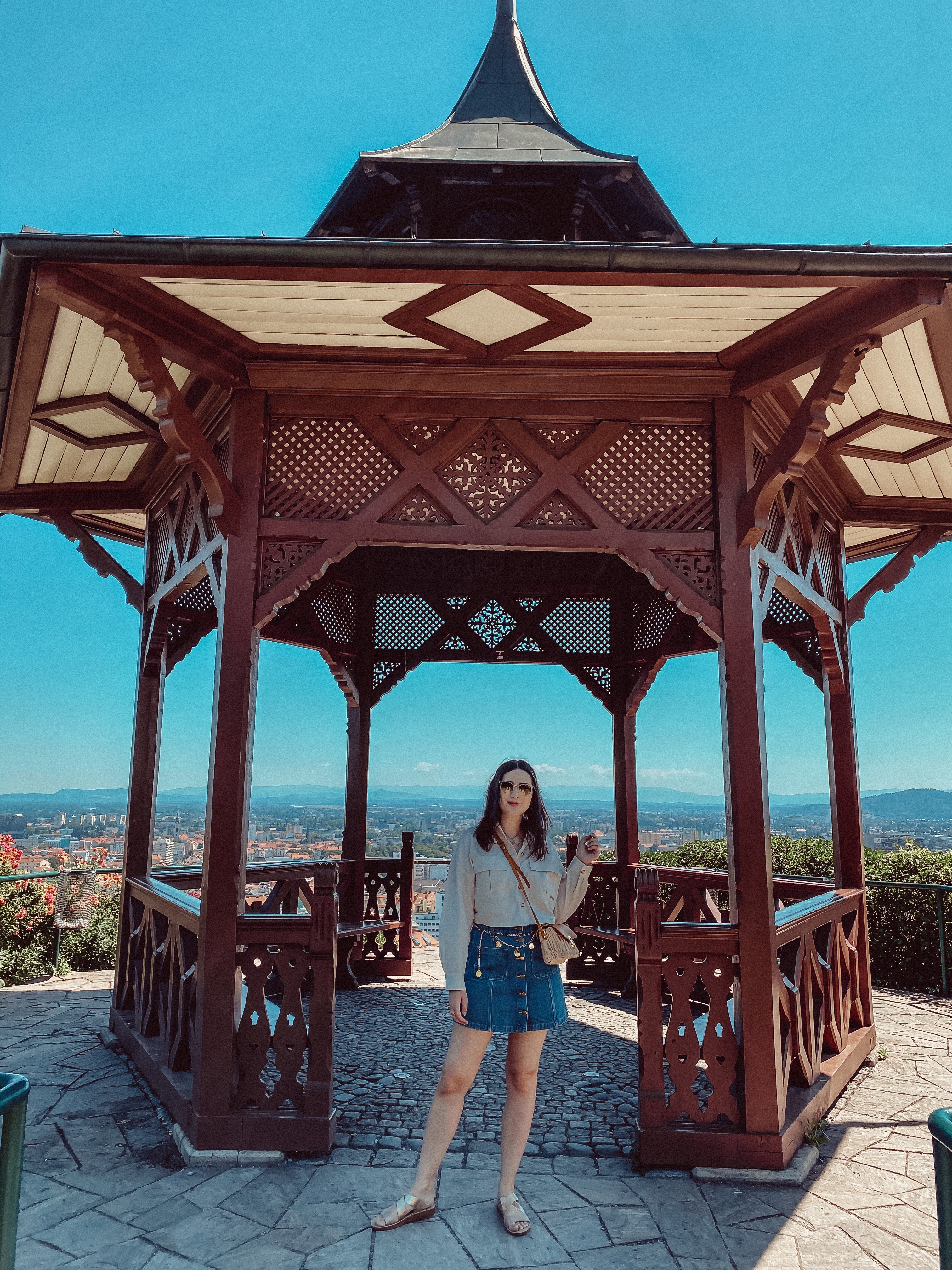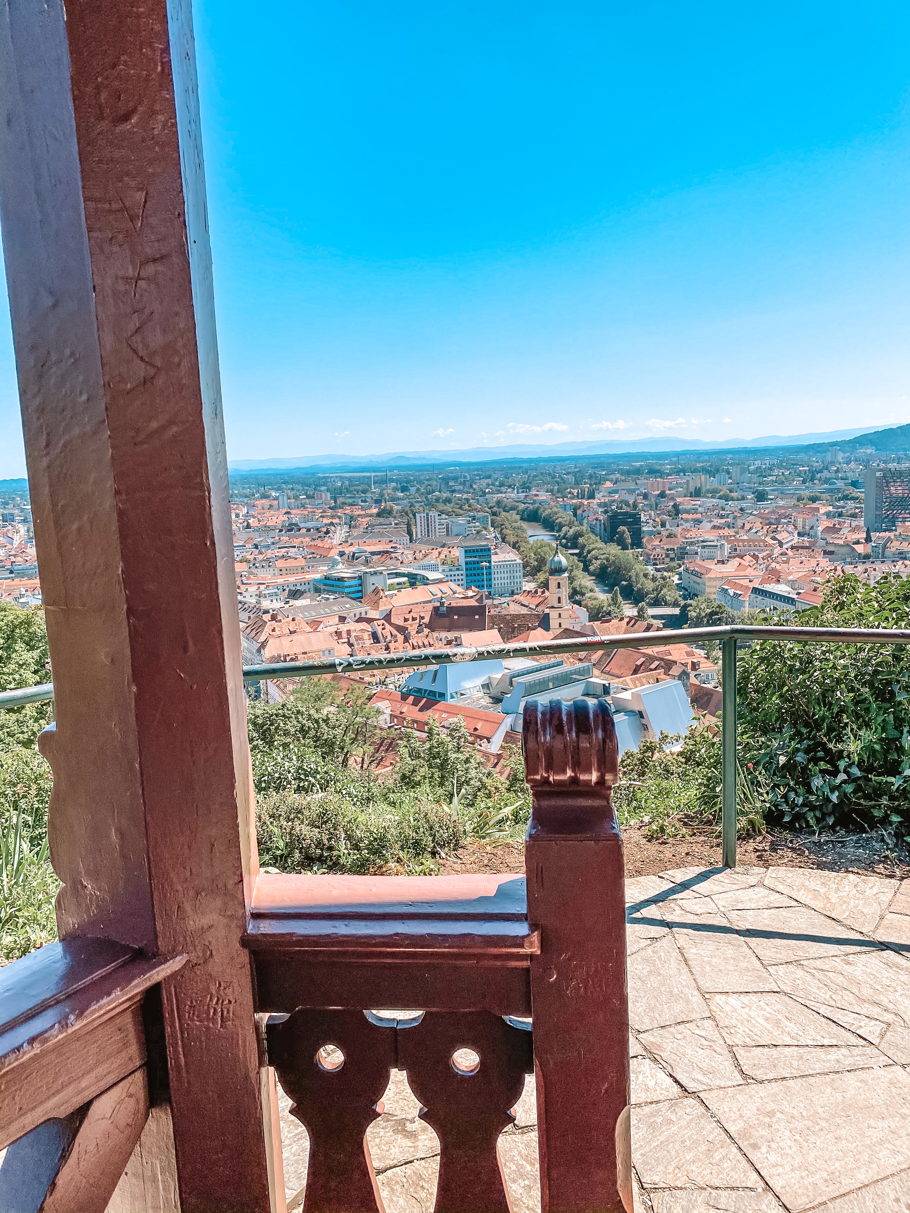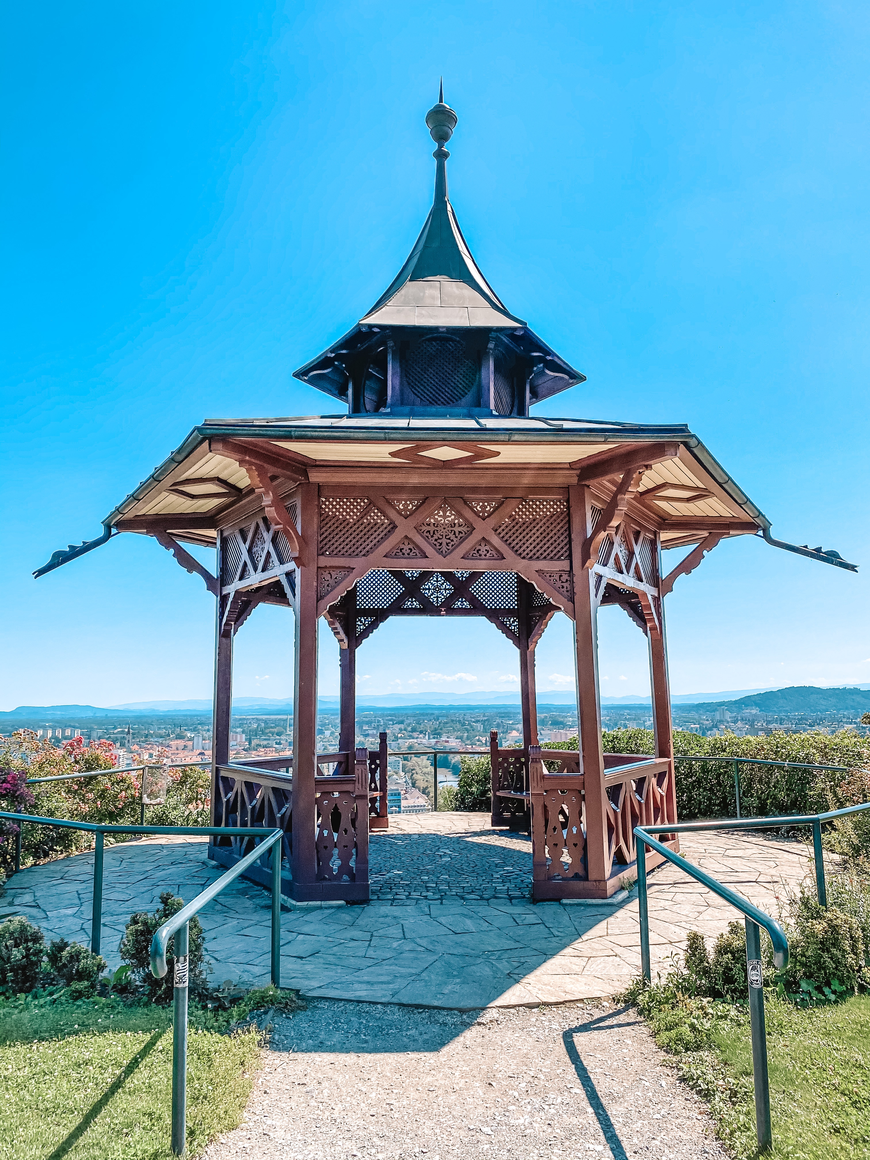 Auf dem kleinen Spaziergang zum Fuße des Schlossbergs sieht man viele interessante Schaufenster und kann das Flair der Stadt genießen. Am Kaiser-Franz-Josef-Kai 38 befindet sich die Talstation Schlossbergbahn, die einen bequem hinauf auf den Schlossberg bringt. Sportbegeisterte können natürlich auch die Treppen hinauf am Schlossbergplatz nehmen. Oben sind wir schon beim letzten Stopp unserer „Weltreise“ angekommen, zwischen dem Türkenbrunnen und dem Uhrturm findet ihr den Chinesischen Pavillon. Von dort aus könnt ihr nicht nur den Uhrturm bewundern, sondern habt auch einen großartigen Ausblick auf die Stadt.