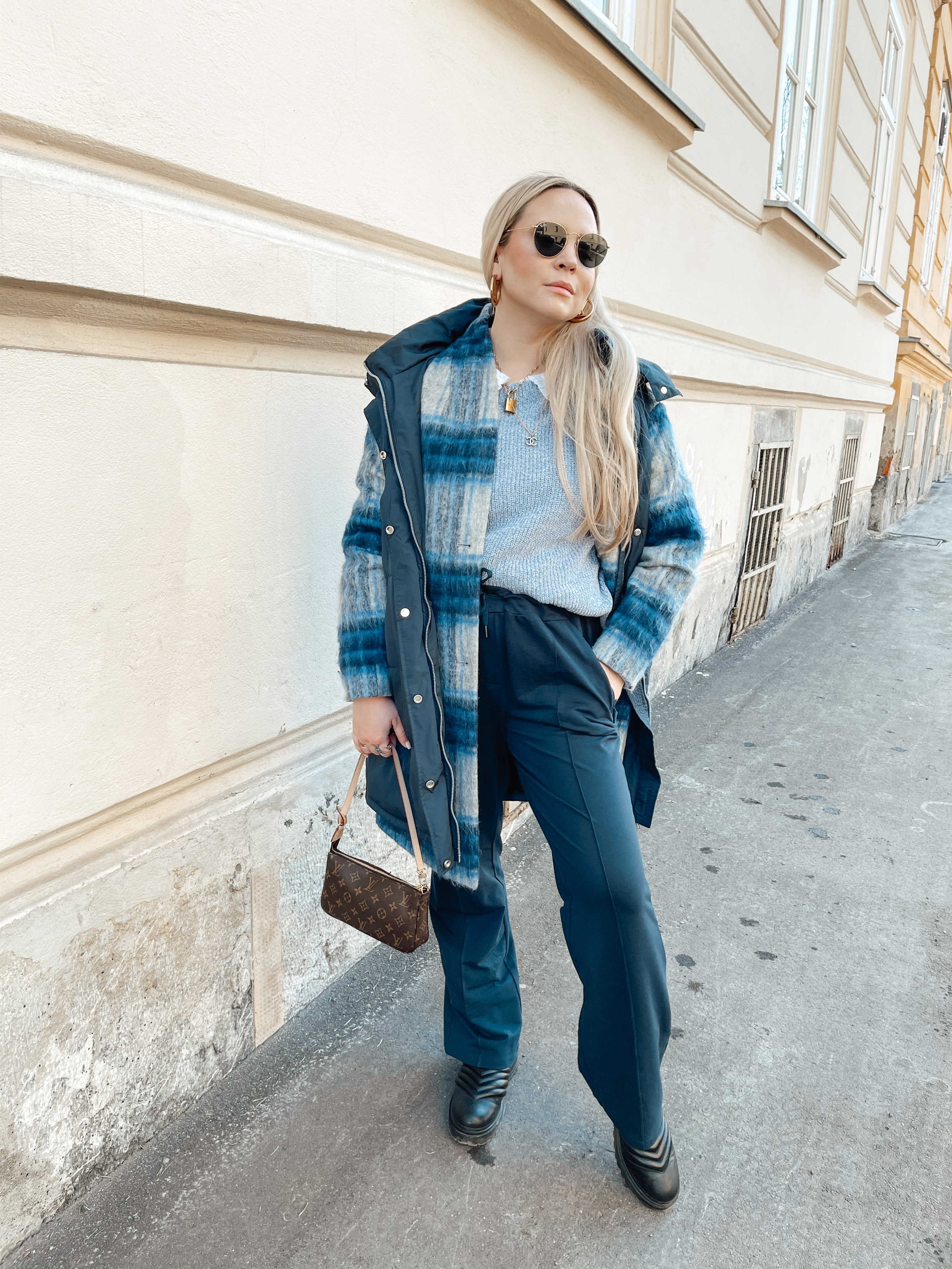 Hier haben wir euch alle Details zu den Looks auf den Bildern markiert: Bild 1: Steppweste, hellblauer Pulli, dunkelblaue Jogginghose mit geradem Bein Bild 2 und 3: Nicki-Hausanzug, Steppweste, Crossbodybag