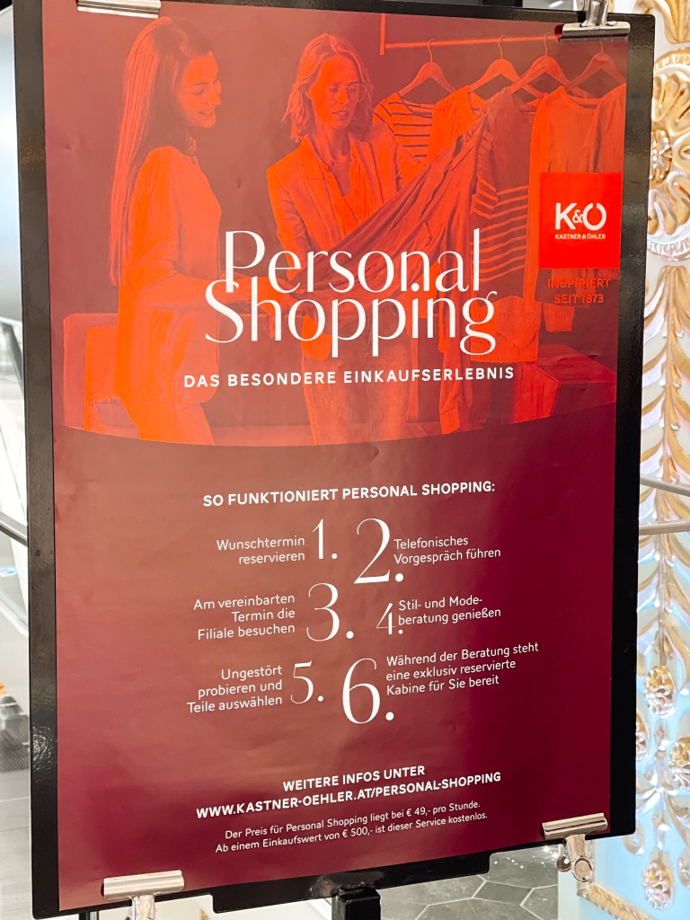 Ein Shoppingerlebnis der besonderen Art bietet auch Kastner & Öhler an. Hier könnt ihr um 49€ pro Stunde oder ab einem Einkaufswert von 500€ sogar kostenlos ein Personal Shopping buchen. Vorab gibt es auch hier ein Willkommensgetränk und eure persönlichen Stil-, Farb- und Einkaufsvorlieben werden ebenfalls im Vorfeld geklärt, bevor ihr im Anschluss von eurem „Personalshopper“ ausgesuchte Outfits in Ruhe probieren und euch persönlich beraten lassen könnt!